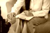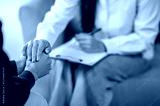 A psychologist holding a patient's hand to comfort them during a mental health consultation.