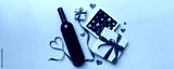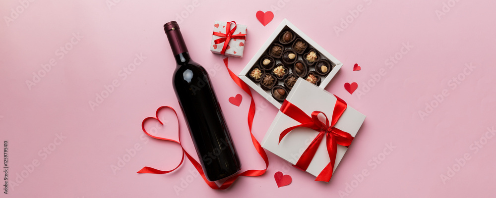 Bottle of red wine on colored background for Valentine Day with gift and chocolate. Heart shaped with gift box of chocolates top view with copy space