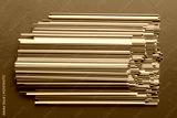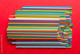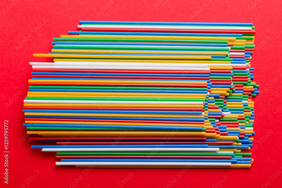 many multi-colored plastic tubes for cocktail on Colored background, top view
