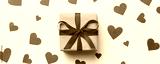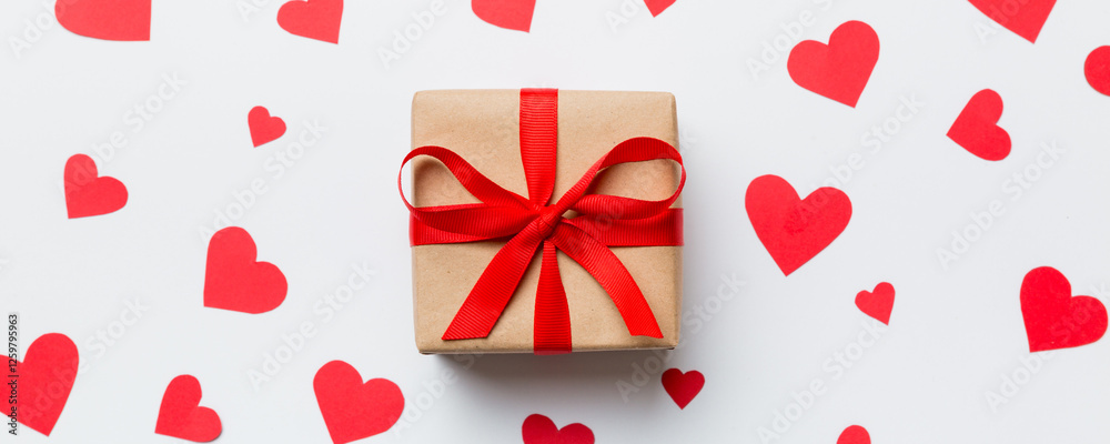 Valentine day composition Background: red gift box with bow and heart. Christmas present. View from above. Holday greeting card