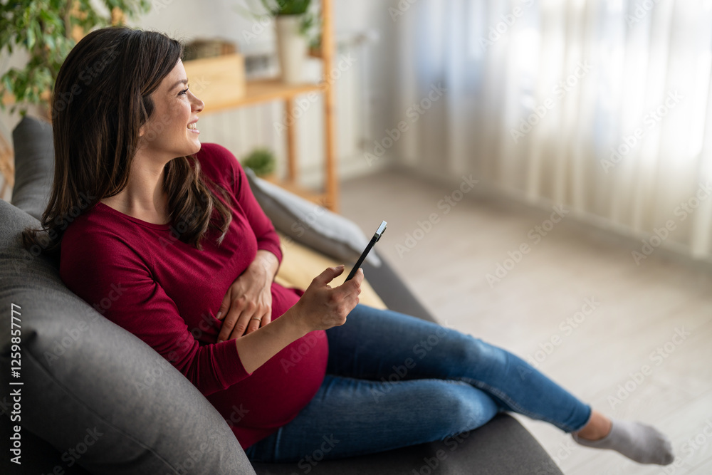 Pregnant woman relaxing in bed using phone app for online pregnancy prenatal class.