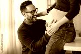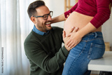 Man in love hugs his pregnant wife, they are waiting together for the baby's arrival. Love, family