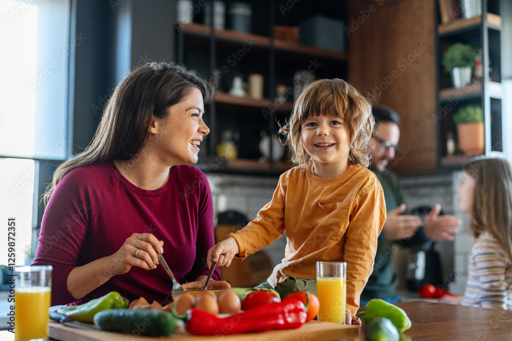 A happy family is cooking together in a bright kitchen, showing joy, teamwork, and love at home