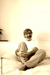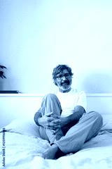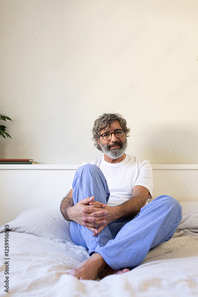 Vertical portrait of mature man wearing pajamas relaxing sitting on the bed looking a camera