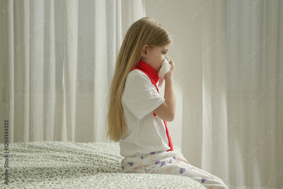 Little 7 year old girl with influenza is sitting in bed and blowing her nose, cold and flu season, runny nose