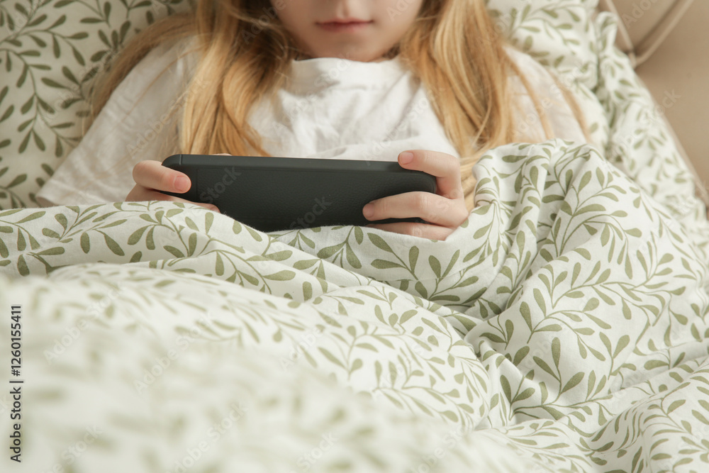 Cute little girl using smartphone at home, looking at screen before sleep time