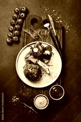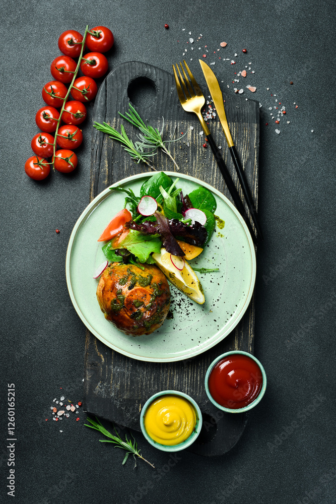 Rye bun with meat and lettuce. In a plate. On a black stone background. Food photo.