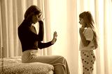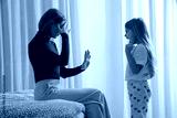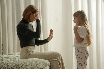 Stressed mother feeling desperate about stubborn daughter who screams.