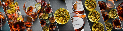 Collage. Different types of strong alcoholic beverages in glasses. On a black stone background.