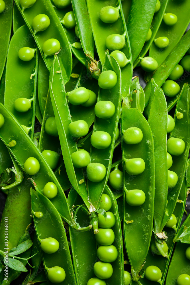 young green peas, macro photo. Top view. Green style.
