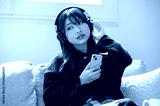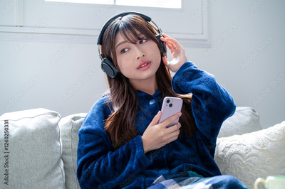 スマホを持ちヘッドホンで音楽を聴く日本人女性
