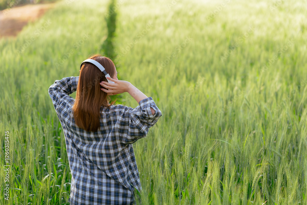 Happy Asian female farmer running in wheat field wearing ear buds working in rice farm. Agriculture and harvest concept