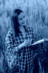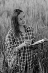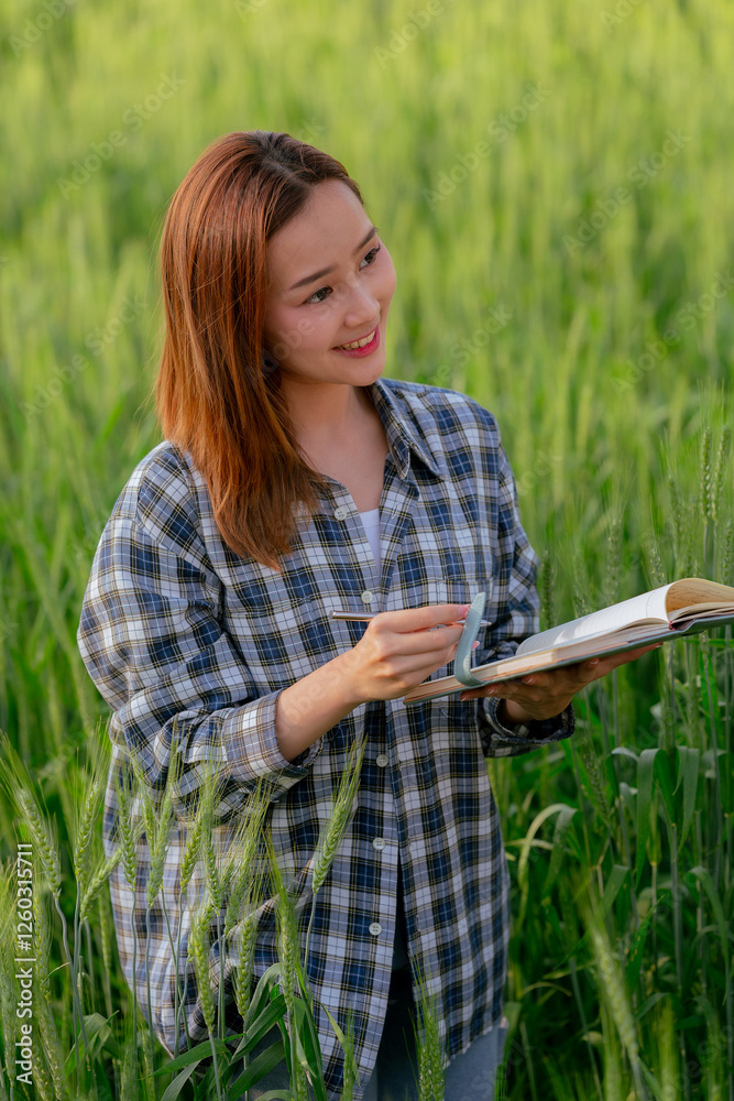 Asian farmer holding notebook in wheat field working in rice farm Concept of agriculture and harvest