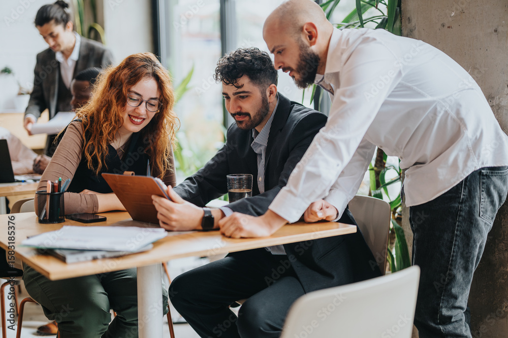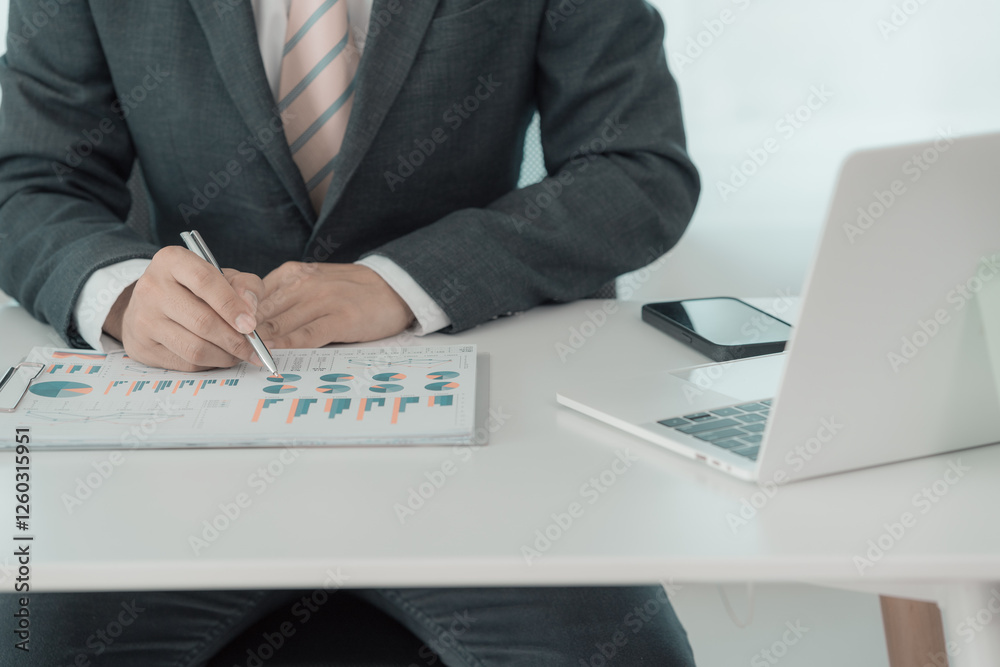 Accountant analyzing investment chart, invoice and pressing calculator button over document, analyzing investment chart with laptop computer on office table, close-up image
