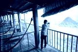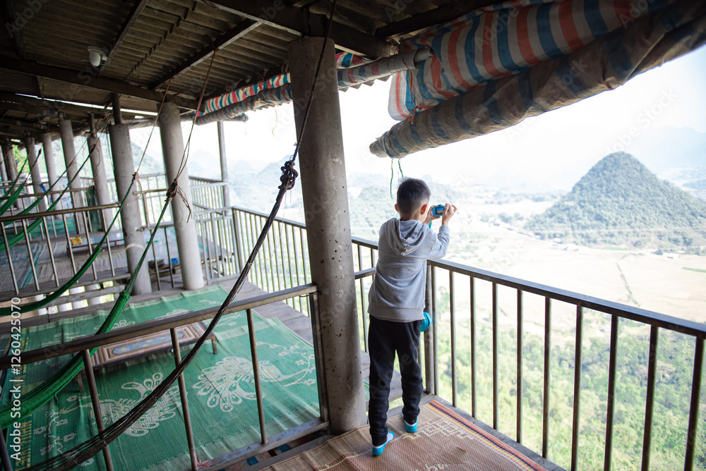 Hammocks, bamboo mat and safety balcony at Vietnamese mountainside restaurant with Asian toddler boy taking aerial landscape photo in Mai Chau, Hoa Binh, active kid in hoodie with digital camera