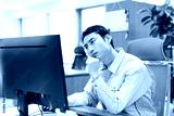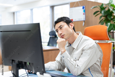 悩む、男性、オフィス、作業員、工場、中小企業、経営、PC、考える、疑問、不満、不安、心配、トラブル、問題、困る、悩み、仕事、バックオフィス、デスクワーク、産業、製造業、人事、労務、管理、コスト、経費、費用、モニター、DX、電子化、ストレス、人手不足、求人、採用、作業服、エンジニア、スタッフ、事務所、建築、建設、工事、工務店、管理職、失敗、パソコン、日本人、技術者、会社員、人物