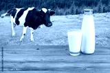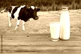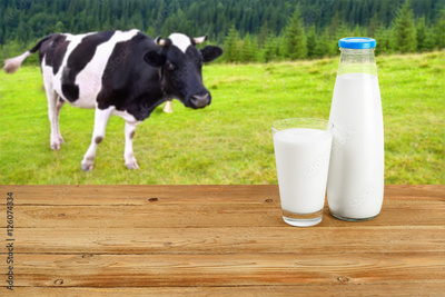 Milk on wooden table with cow on the background