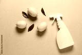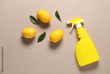 Flat lay composition with spray bottle of cleaning product and lemons on beige background