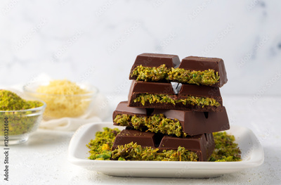 Dubai chocolate, milk chocolate filled with pistachio paste and kunefe