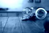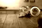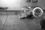 Cookies spilling out of a glass jar onto the table top with a blurred background of the kitchen interior.