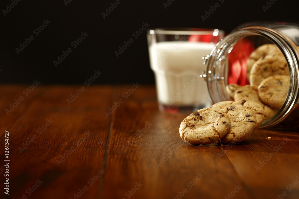 Cookies and glass of milk on wooden table with black smoky wall background.