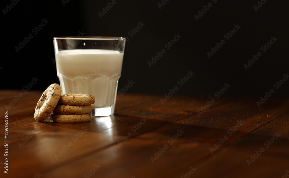 Cookies and glass of milk on wooden table with black smoky wall background.