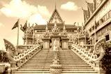 Wat Kean Kleang golden buddhist pagoda temple walls, stairs and statues with many asura titans holding Naga snake statue, Phnom Penh, Cambodia