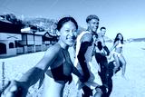 Joyful Group of Friends Is Having Fun at the Beach While Holding Hands and Running Along the Shoreline. They Are Creating Memorable Experiences Together Under the Sunshine on a Beautiful Summer Day