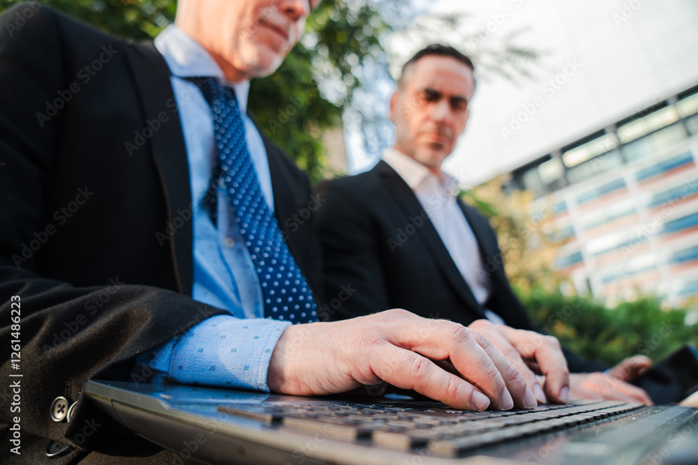 Close up portrait of the hands of a businessman typing on a laptop. Two Professional Businessmen Engaged in Focused Work Collaborating and Productivity Between Mature Males in a Business Context