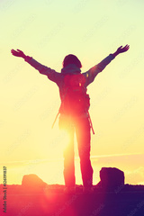 Happy hiker freedom having reached summit goal with success at sunset. Silhouette of woman with backpack celebrating winning standing at mountain top with arms up in celebration during hiking travel.