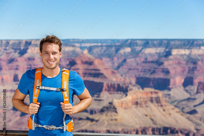 Grand Canyon hiker man portrait with backpack bag. Hiking male tourist on Grand Canyon, Arizona, USA. Hiking athlete enjoying view of nature landscape wearing backpack. Young man relaxing after hike.