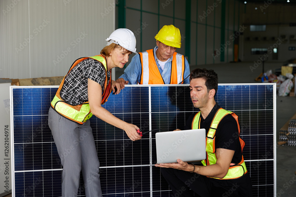 workers or technicians working on laptop computer and holding solar panel in the factory