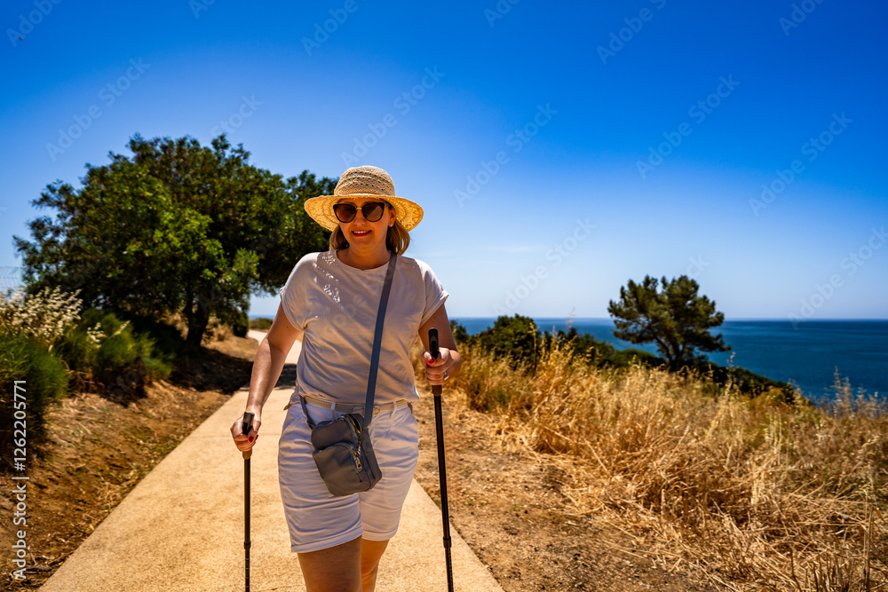 Active summer vacation. Mature woman tourist in sun hat walking with poles during sightseeing coast on beautiful sunny day. Front view