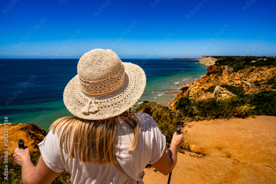 Active summer vacation. Mature woman tourist in sun hat standing with Nordic poles at viewpoint during sightseeing coast on beautiful sunny day. Back view