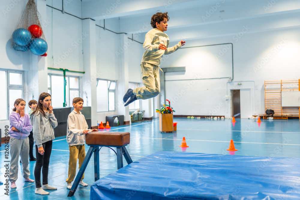 Teenage boy performing gymnastics jump in school gym class with classmates watching