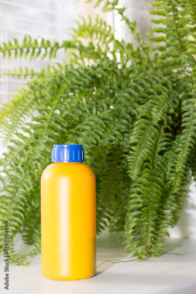 Yellow fertilizer bottle and tropical plant on sunny windowsill. Home gardening concept.