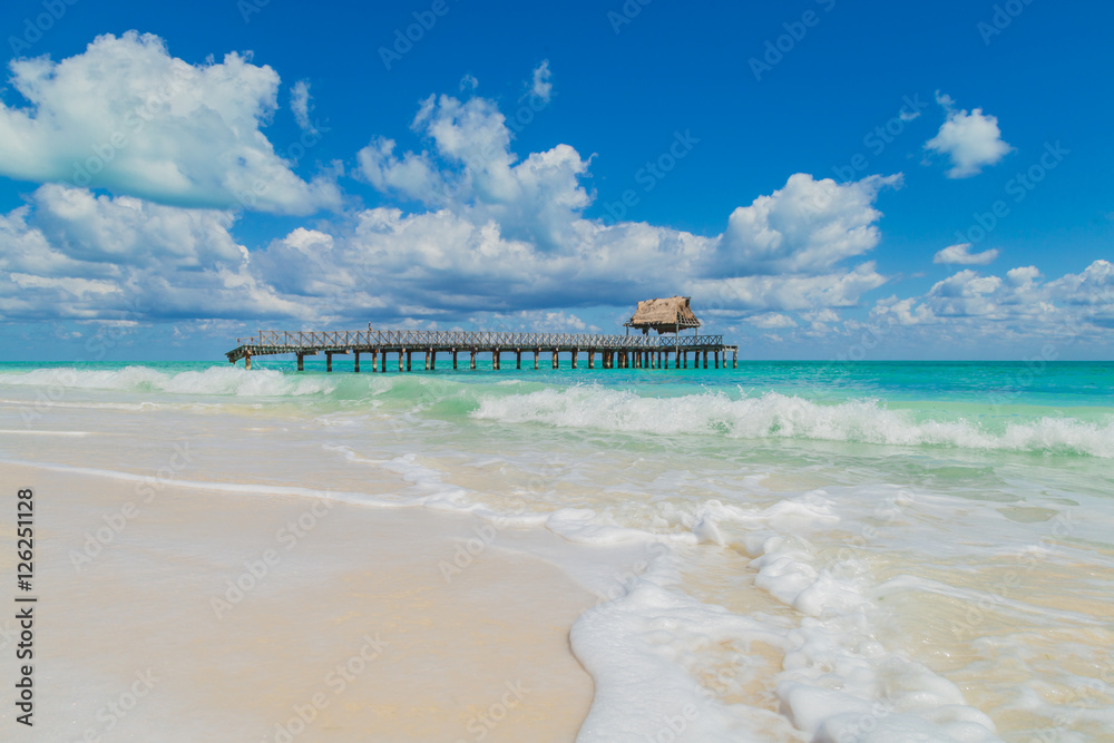 Destroyed jetty in the ocean. wild beach. Houseboat. Beautiful beach. Isla blanca