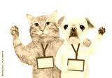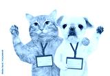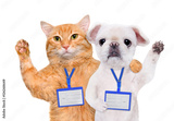 Dog and cat wear blank white badge mockup . Isolated on the white.