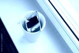 Drip bag in a ceramic cup on windowsill. Instant freshly brewed alternative filter drink in mug. Easy brew black coffee method for home, travel or office. cozy trendy lifestyle