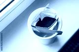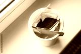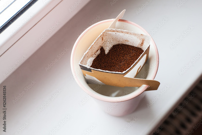 Drip bag in a ceramic cup on windowsill. Instant freshly brewed alternative filter drink in mug. Easy brew black coffee method for home, travel or office. cozy trendy lifestyle