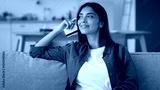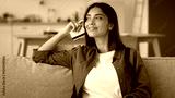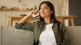 Happy smiling Indian woman Arabian girl client customer buyer female Muslim lady at home couch sofa kitchen shopping online mobile phone order food delivery enter number credit bank card buy purchase