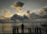 Silhouette people standing at sunset background with fishing equipment on the lake
