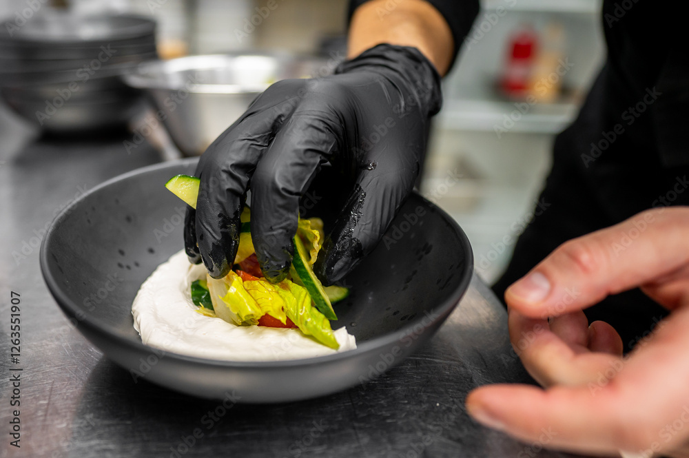 A chef is skillfully assembling a dish in a modern kitchen. Fresh ingredients are layered on creamy sauce in a stylish bowl, showcasing attention to detail and culinary artistry.