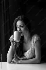 A attractive young brunette siting with white cup of coffee in kitchen near window