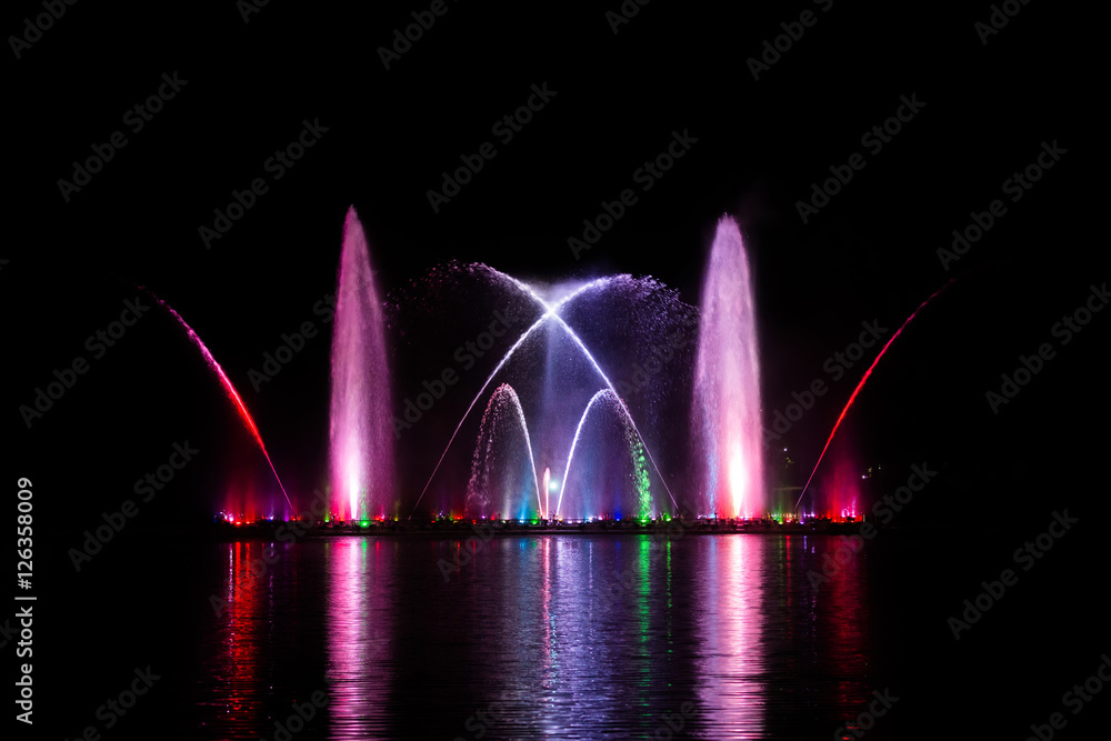 Beautiful fountain dancing show with reflection on water at night.