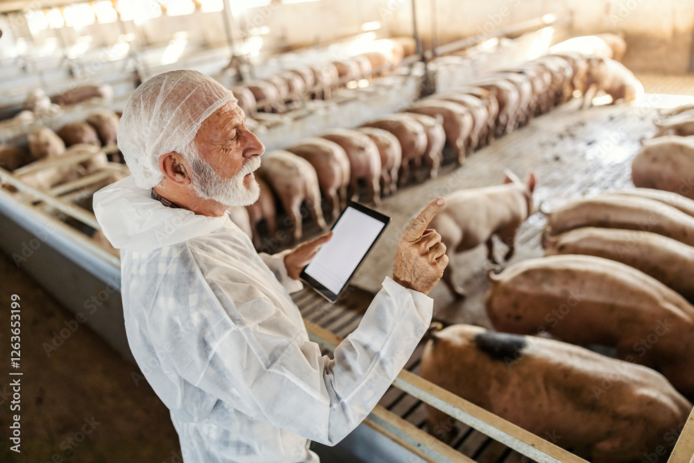 An old farmer in sterile uniform with tablet in hands counting pigs and using technologies for modern farming.