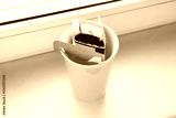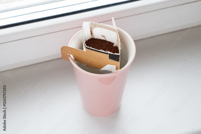 Drip bag in a ceramic cup on windowsill. Instant freshly brewed alternative filter drink in mug. Easy brew black coffee method for home, travel or office. cozy trendy lifestyle