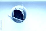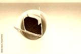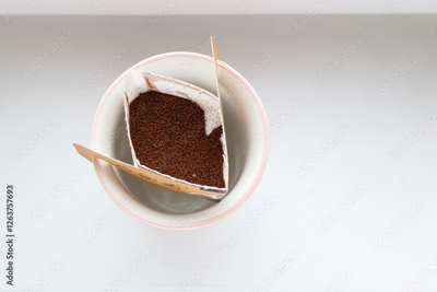 Drip bag in a ceramic cup on windowsill. Instant freshly brewed alternative filter drink in mug. Easy brew black coffee method for home, travel or office. cozy trendy lifestyle