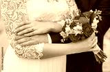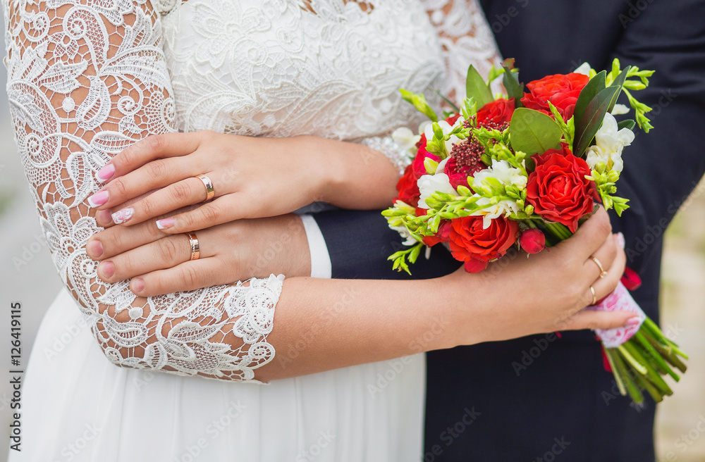 Two golden wedding rings on fingers of just married people. Elegant bride and groom posing together for photographer outdoors on wedding day. Close up of hands and bright bridal flowers.
