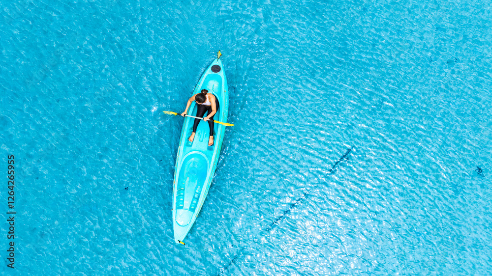 Aerial view of a kayak in the blue sea .man kayaking he does water sports activities.